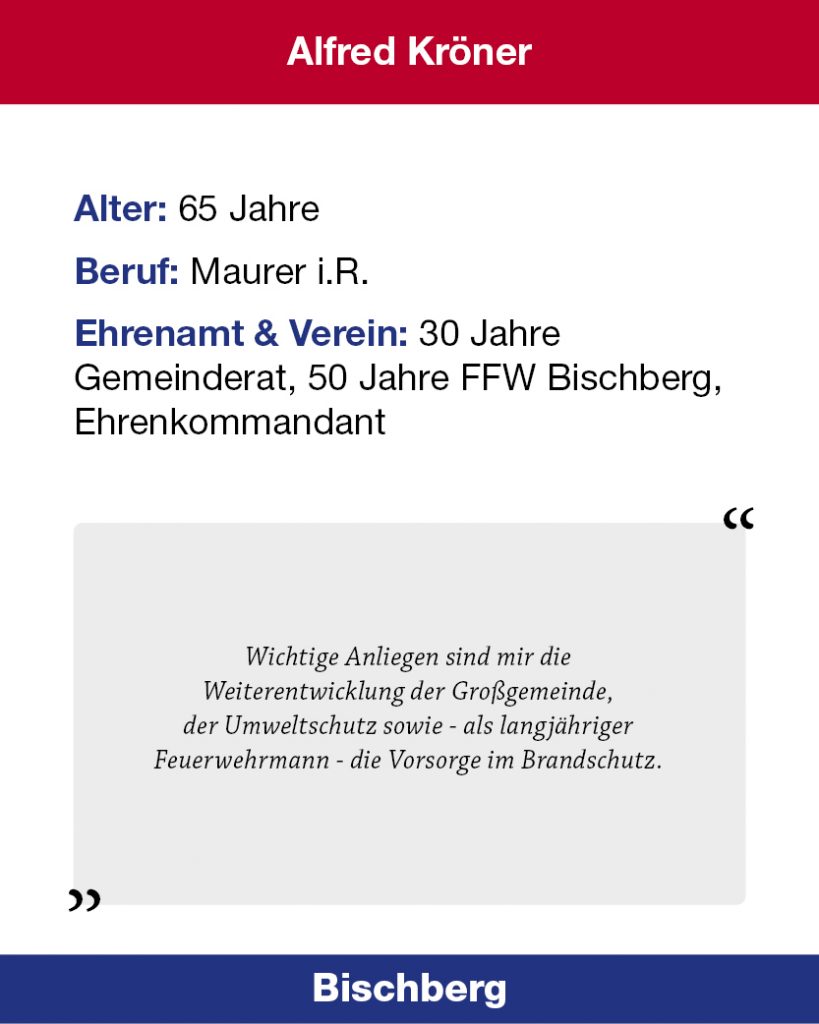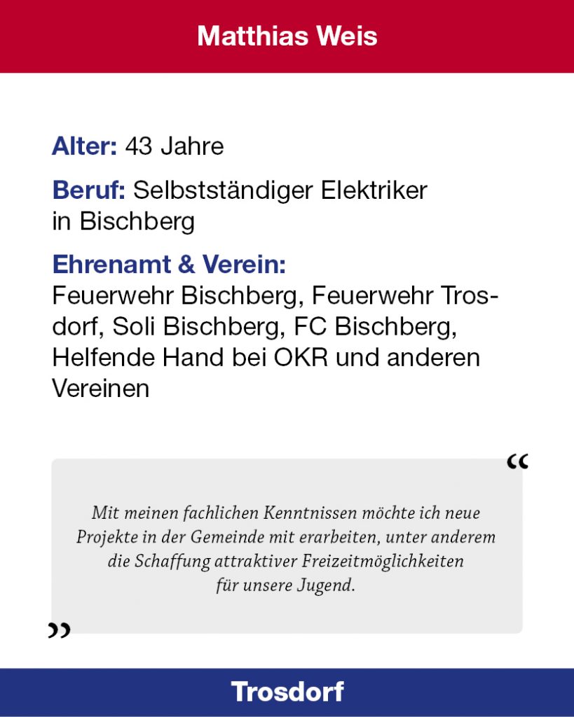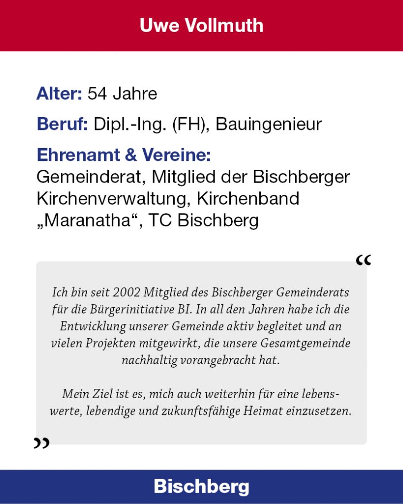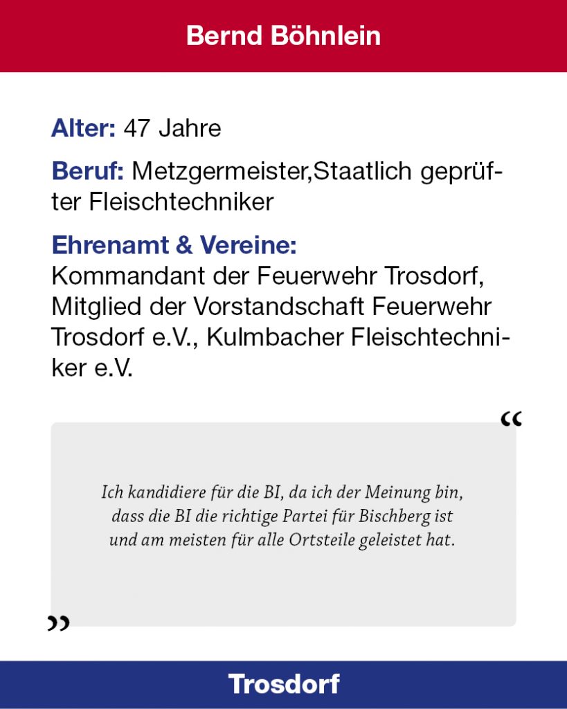 Als erster Vorsitzender der Wählergemeinschaft Bürgerinitiative BI Bischberg + Trosdorf + Tütschengereuth + Weipelsdorf darf ich Sie hier herzlich begrüßen.